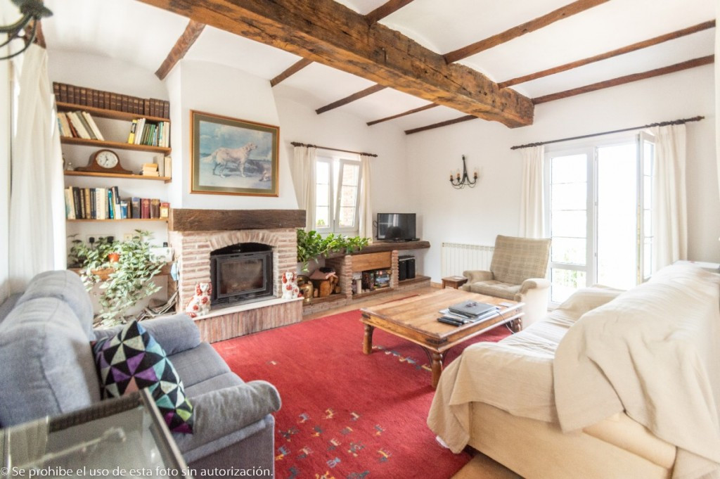 On the left side of the house is the large fully equipped kitchen with breakfast table and access door to the summer patio with panoramic views of the mountains. Separate dining room and very cozy living room with fireplace and lots of natural light.