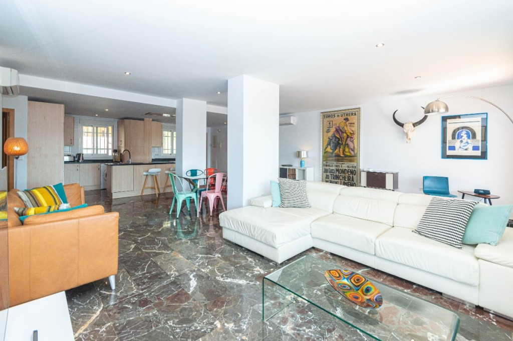 The large terrace has a seating area and another area ideal for barbecues where there is a large table for 8 people.