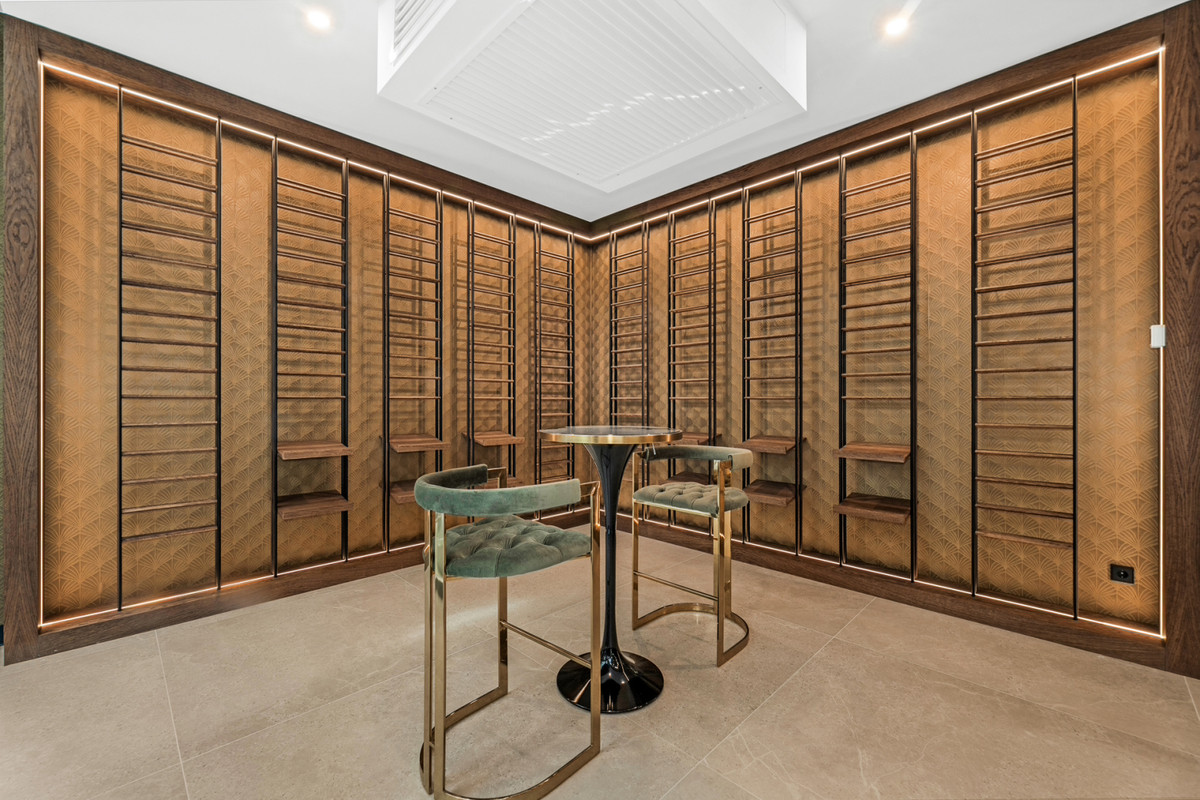 The home is spread over three levels and includes a luxury spa with indoor heated pool, Finnish sauna, Turkish bath, a fully equipped gym, games room, bar, and wine cellar. Two glass cubes and floor-to-ceiling windows create bright, open spaces filled with natural light.